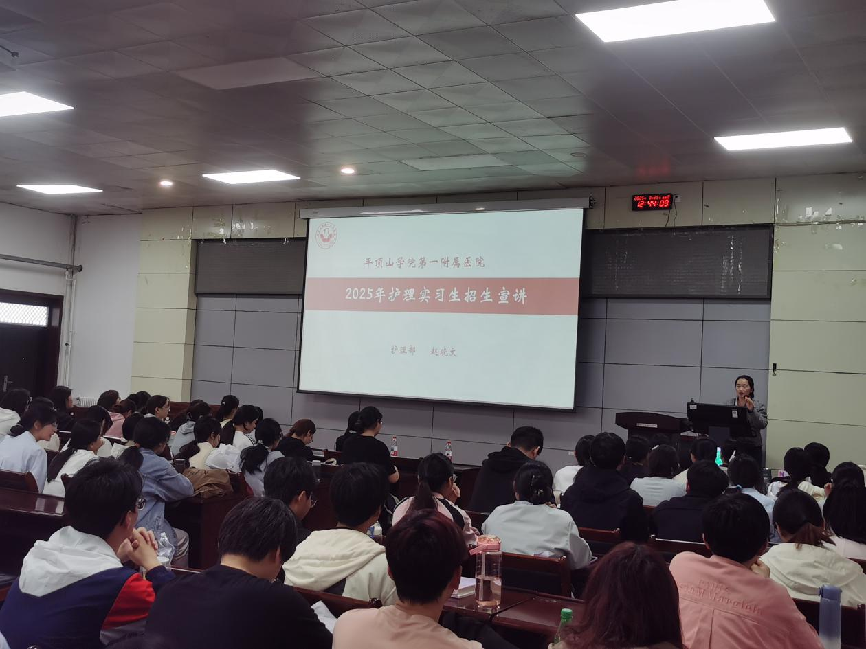 为深化院校合作,推动护理人才培养高质量发展,3月25日和4月8日,今年会官网第一附属医院护理部主任吴玉红一行莅临今年会,在A406多媒体教室开展2026届护理实习生遴选工作。本次活动通过专场宣讲会与现场面试相结合的方式,选拔优秀实习生。活动由实习管理办公室主任余小柱主持,今年会官网第一附属医院护理部副主任赵晓文、实习指导教师朱晓辉及400余名护理专业学生共同参与。