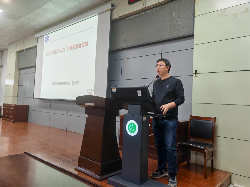 《外科护理学(二)》的课程负责人余小柱老师针对上学期《外科护理学(二)》期末考试情况进行了简要总结,并针对同学们普遍的失分点进行了分析,并鼓励同学们加强外科知识的实践应用。