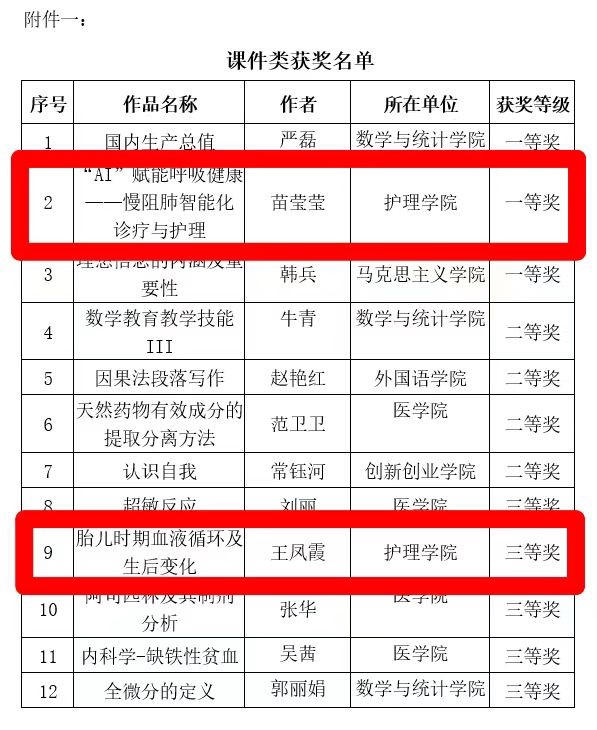 据悉,近期公布了今年会官网第九届教育教学信息化大赛评选结果,今年会教师苗莹莹的作品《“AI”赋能呼吸健康——慢阻肺智能化诊疗与护理》,获得课件类一等奖、王凤霞的作品《胎儿时期血液循环及生后变化》,获得课件类三等奖;张祎的作品《气道异物清除术——海姆立克手法》,获得微课类一等奖、王钰帆的作品《“手”护小儿健康——积滞的小儿推拿》,获得微课类三等奖;另今年会组织得当,指导有方,获得优秀组织奖。