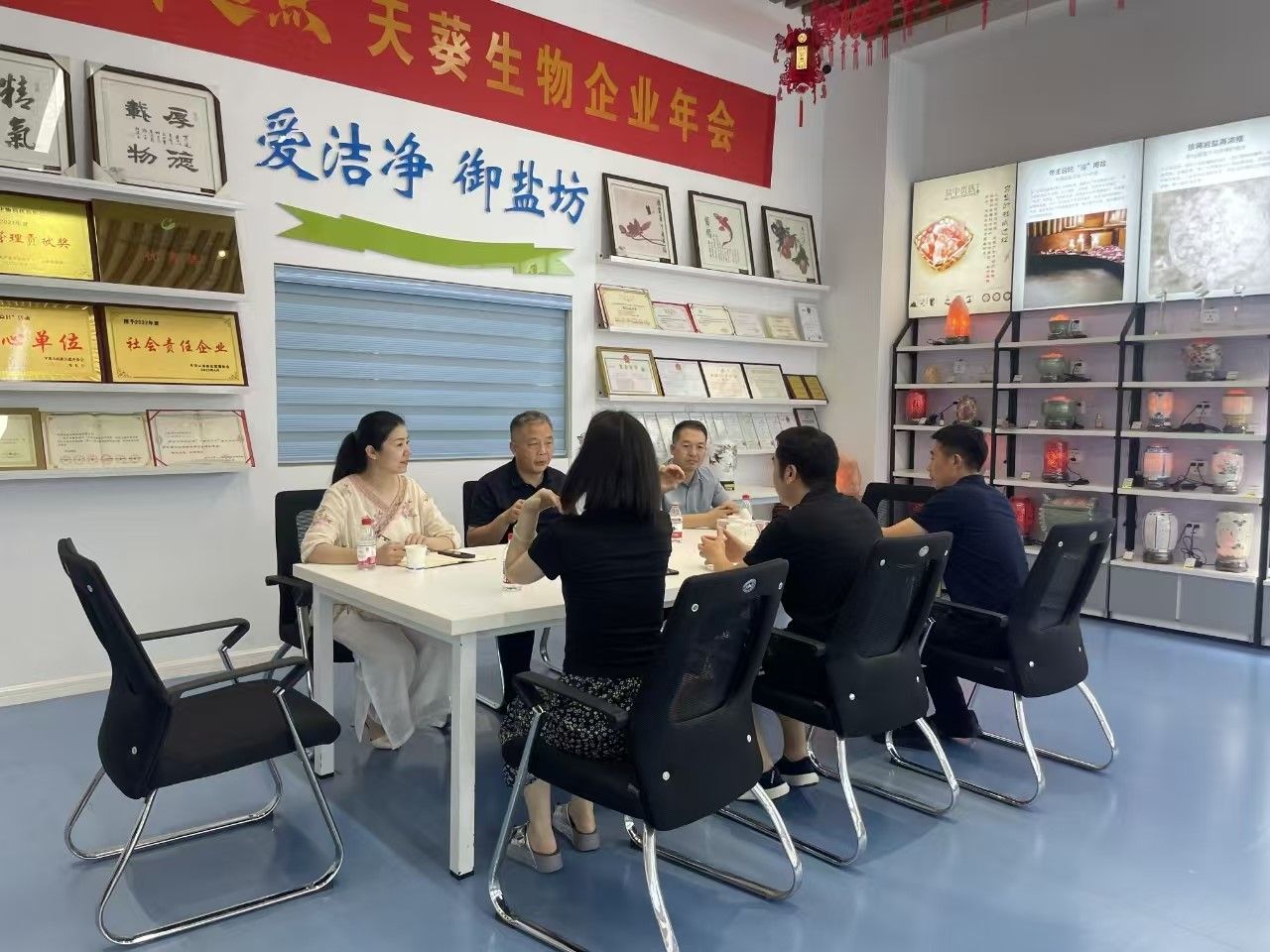 7月4日,今年会院长夏西超等一行赴天葵生物公司考察,天葵生物公司经理张坤阳、平顶山市友谊皮肤科医院院长贾世刚、豫医方健康管理有限公司经理孙晓峰共同参与交流。